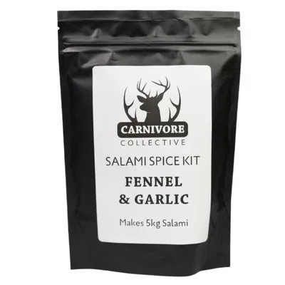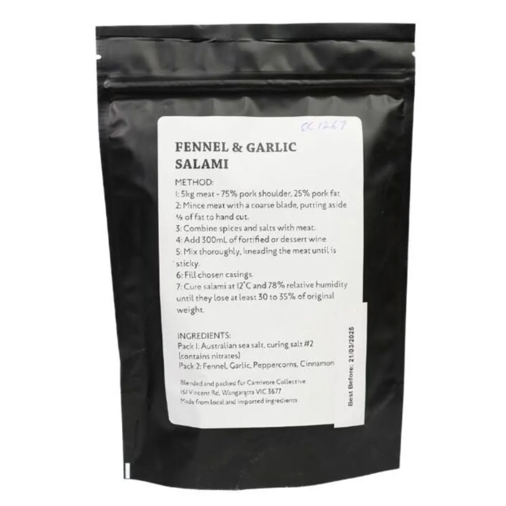 Fennel and Garlic salami spice: Sweet and aromatic fennel supported by rich garlic and lingering Kampot red peppercorns. Ingredients: Australian Sea Salt, Curing Salt #2 (sulphates), Fennel, Garlic, Peppercorns, Cinnamon