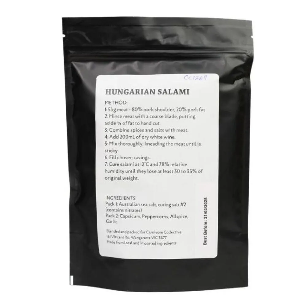 Hungarian: Decidedly flavoursome combination displaying fragrance and depth rather than chilli or heat. Ingredients: Australian Sea Salt, Curing Salt #2 (sulphates), Capsicum, Peppercorns, Allspice, Garlic