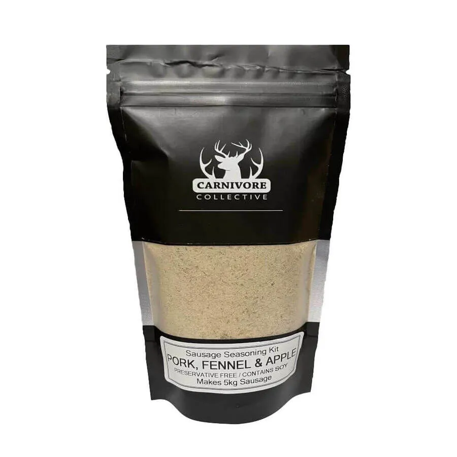 Sausage Seasoning Kit - Pork, Fennel & Apple | Home Butchery. Pork pairs harmoniously with aromatic fennel and bursts of succulent green apple. We strongly suggest incorporating refreshing apple cider for added sweetness and complexity. This seasoning mix can also elevate the flavour of hamburgers.