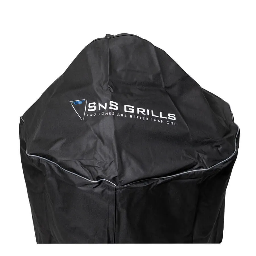 SNS Grills Kettle Grill covered with a black protective cover, placed outdoors on a wooden deck beside a planter box.