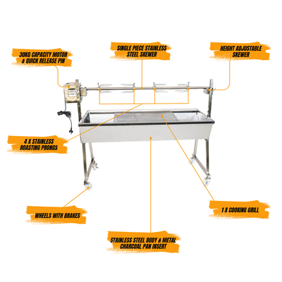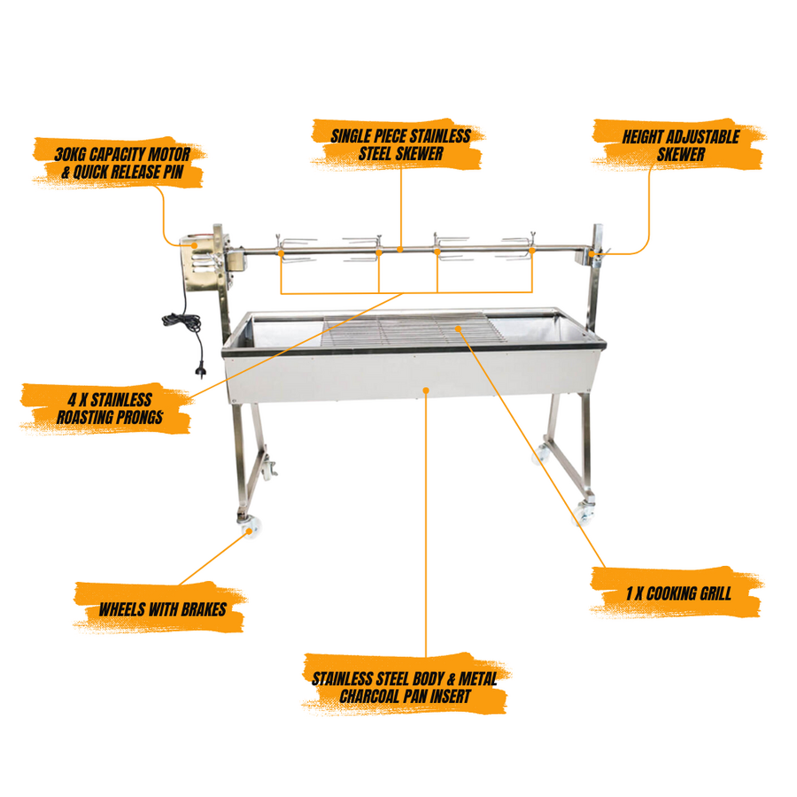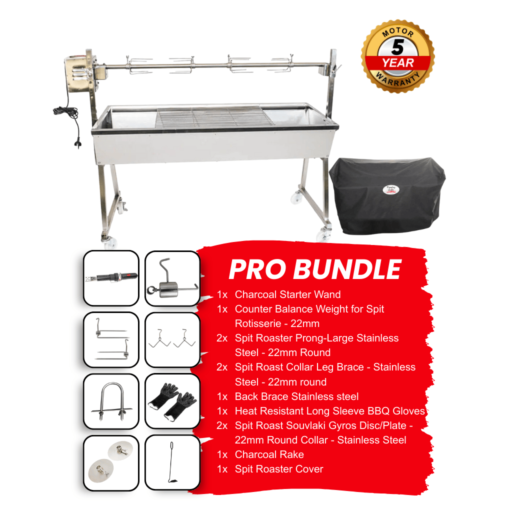 The Minion 1200 Stainless Steel Spit Rotisserie Pro Bundle gives you everything you need to step confidently into charcoal spit roasting. With a proven stainless steel rotisserie at its core and the right accessories to support whole animal and everyday cooks, this bundle is built for reliability, value, and long-term enjoyment. Order now for fast shipping Australia-wide and enjoy hassle-free 60-day returns. Don’t just cook, create memories around the fire with every roast you prepare.