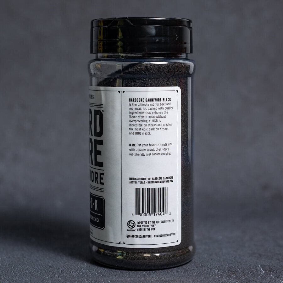 Hardcore Carnivore Black Rub 368g.This black has all the standard spices and ingredients to take your steaks and meats to the next level, with the addition of one exotic ingredient… there's charcoal in the rub!