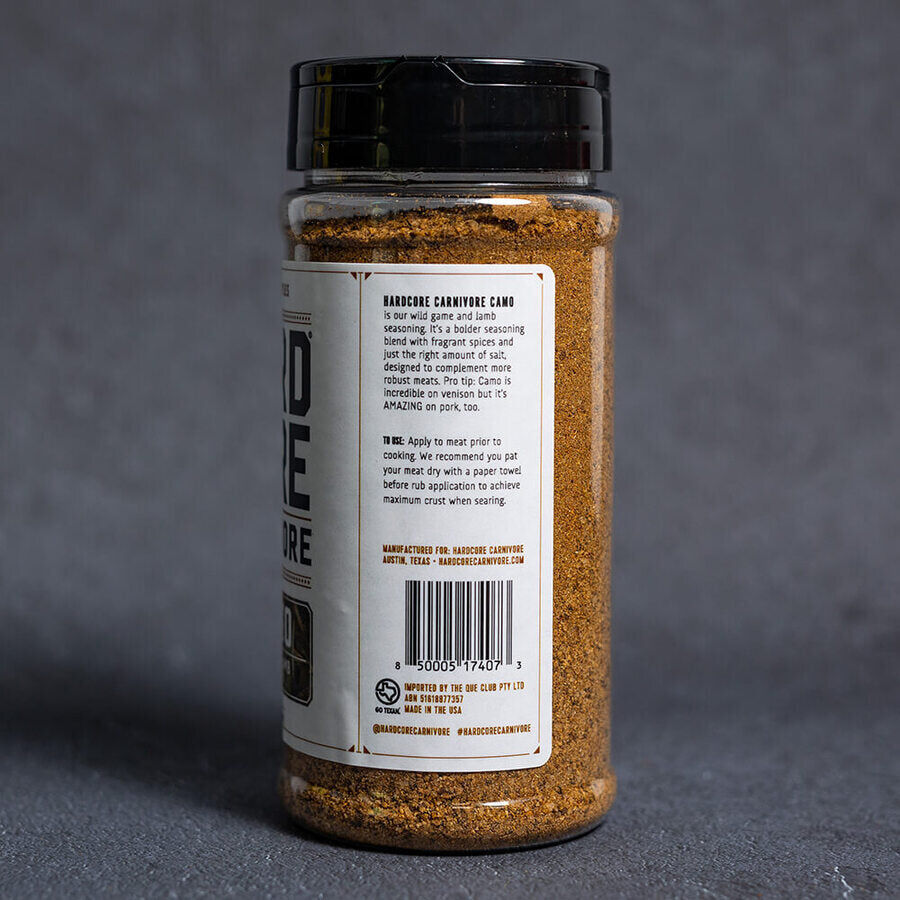 Hardcore Carnivore Camo Rub 297g will add incredible flavour to your lamb and game meats, with exotic notes of coriander and fragrant spices and just the right amount of salt. Unlike other seasonings, CAMO is designed not overpower the meat but to enhance it. Just apply to meat prior to cooking.