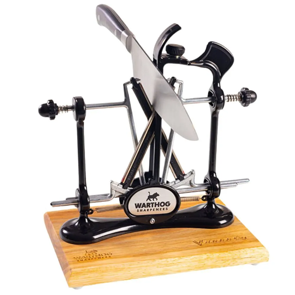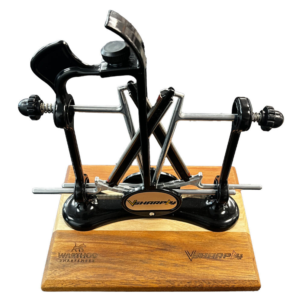 Warthog V Sharp A4 Elite Black. Dealing with dull knives is a common frustration, but the all-new ELITE A4 offers the perfect solution. Based on the bestselling A4 model, it features a deluxe wooden base for effortless sharpening. Equipped with dual 325-grit diamond hones, it sharpens both sides of the blade at once for superior precision.