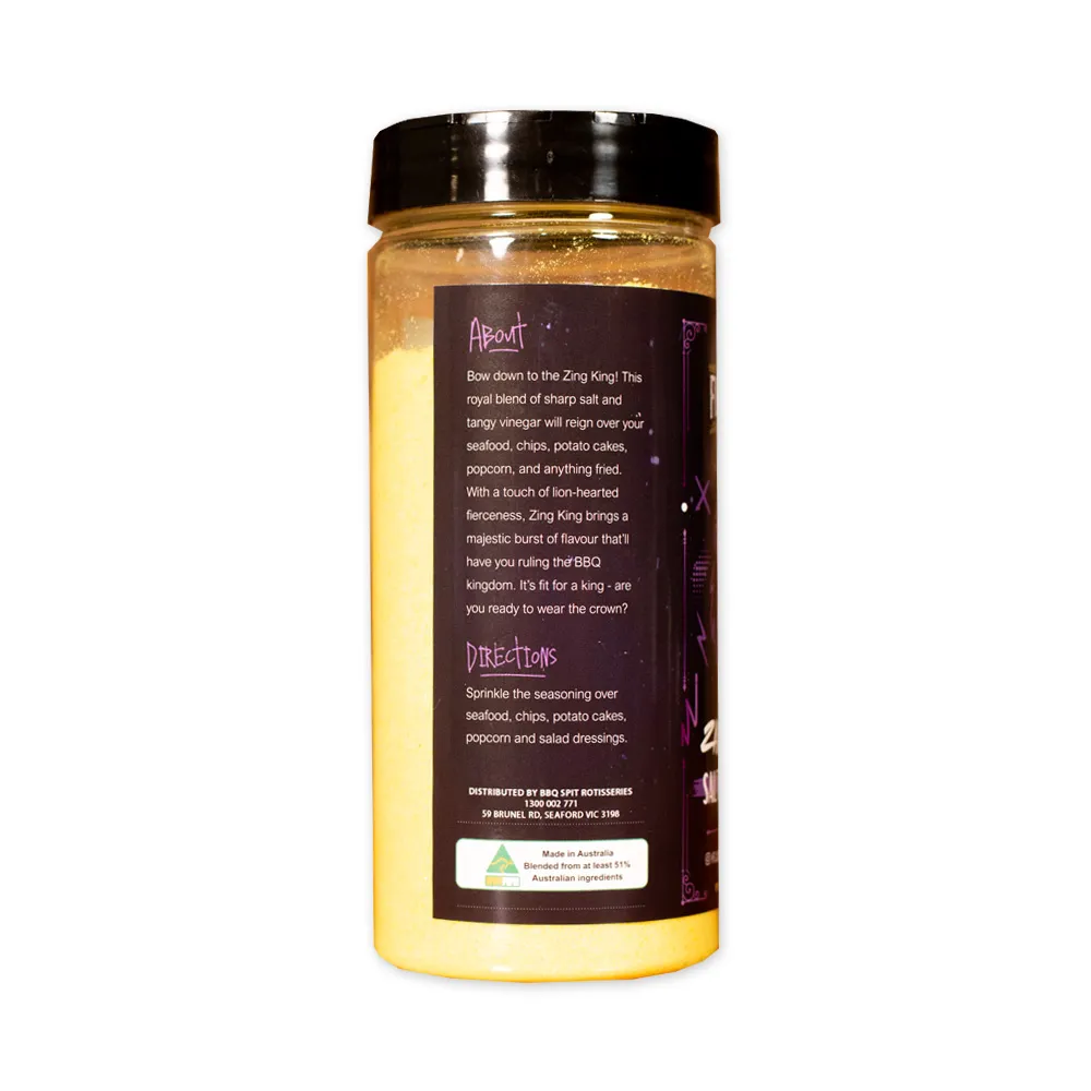 Bow down to the Zing King! This royal blend of sharp salt and tangy vinegar rules over seafood, chips, potato cakes, popcorn, and anything fried. With lion-hearted fierceness, Zing King delivers a majestic burst of flavour that transforms everyday dishes into a flavour-packed BBQ feast.